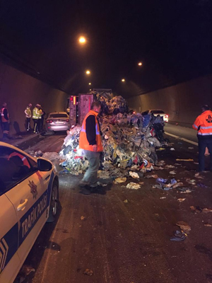 Kocaeli TEM Otoyolu tünel içinde otomobilin tıra çarpması sebebiyle kaza meydana geldi. Çarpmanın şiddetiyle tırın kasasında bulunan atık malzemeler yola saçılırken, kaza sebebiyle trafikte uzun kuyruklar oluştu.