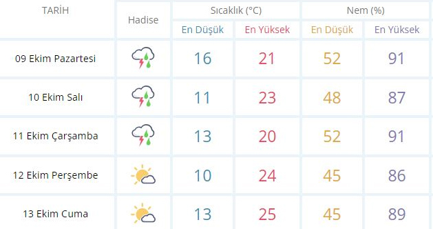 Pazartesi günü en düşük 16, en yüksek 21, Salı günü en düşük 11 en yüksek 23 Çarşamba günü ise en düşük 13 en yüksek 20 derece dolaylarında seyredecek.