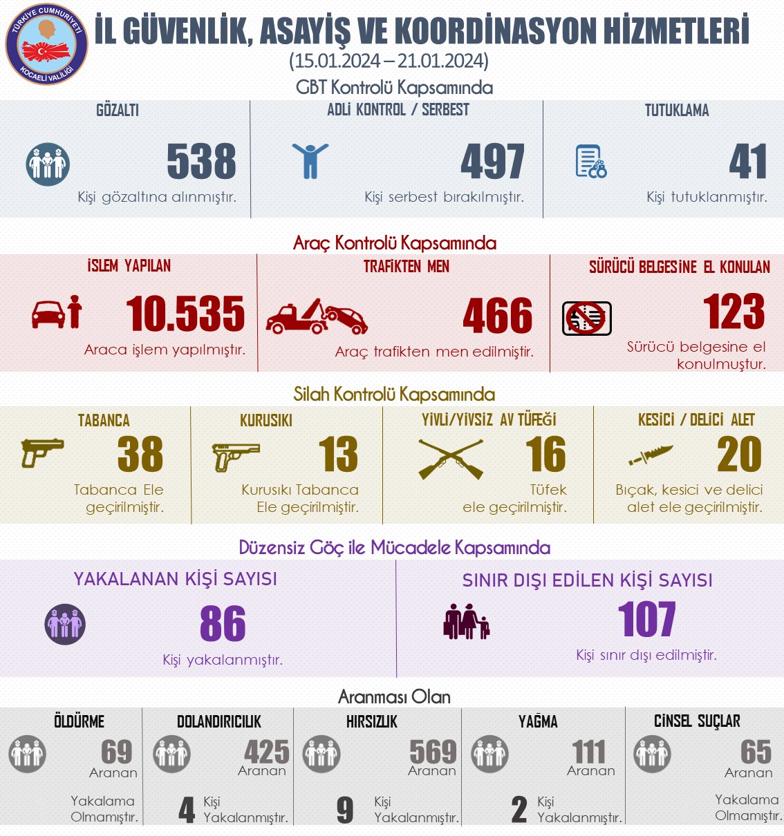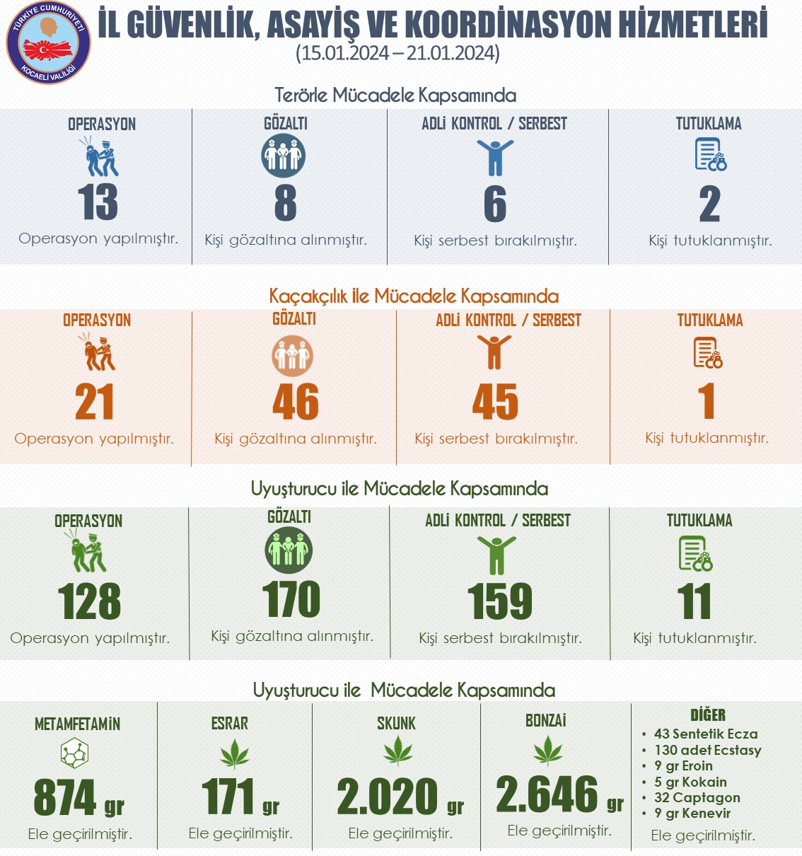 Kocaeli Valisi Seddar Yavuz,sosyal medya hesabından 15-21 Aralık tarihleri arasında Kocaeli gerçekleşen operasyonlar ile ilgili açıklama yaptı.