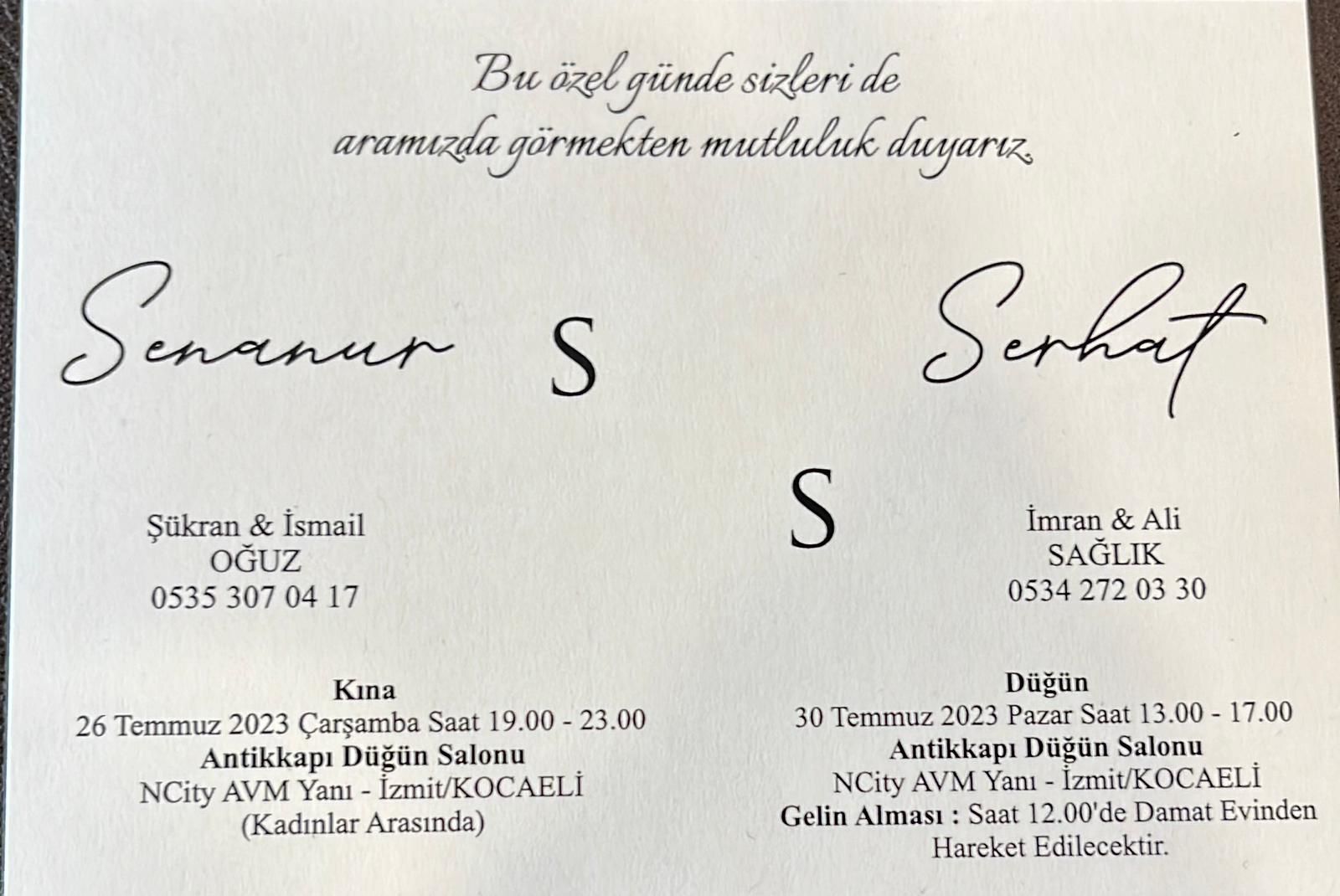 Kocaeli Büyükşehir Belediyesi İSU Genel Müdürü Ali Sağlık ile İmran Sağlık’ın oğlu Serhat Sağlık, hayatını İsmail-Şükran Oğuz çiftinin kızı Senanur Oğuz ile birleştirmeye hazırlanıyor. Genç çift 30 Temmuz’da (NCTY AVM Yanı) Antikkapı Düğün Salonunda Saat 13.00'te başlayacak olan düğünle dünya evine girecek.
