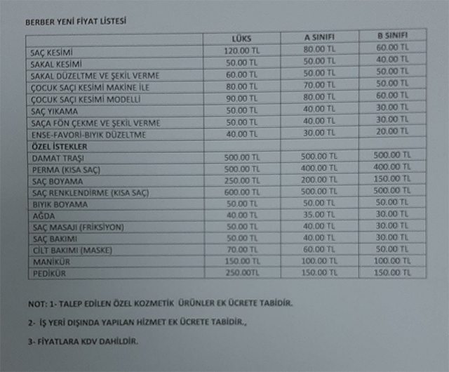 Kocaeli'de berber tariflerine zam geldi. Yeni tarifeye göre saç sakal kesimi yıkamayla birlikte 100 lira oldu.