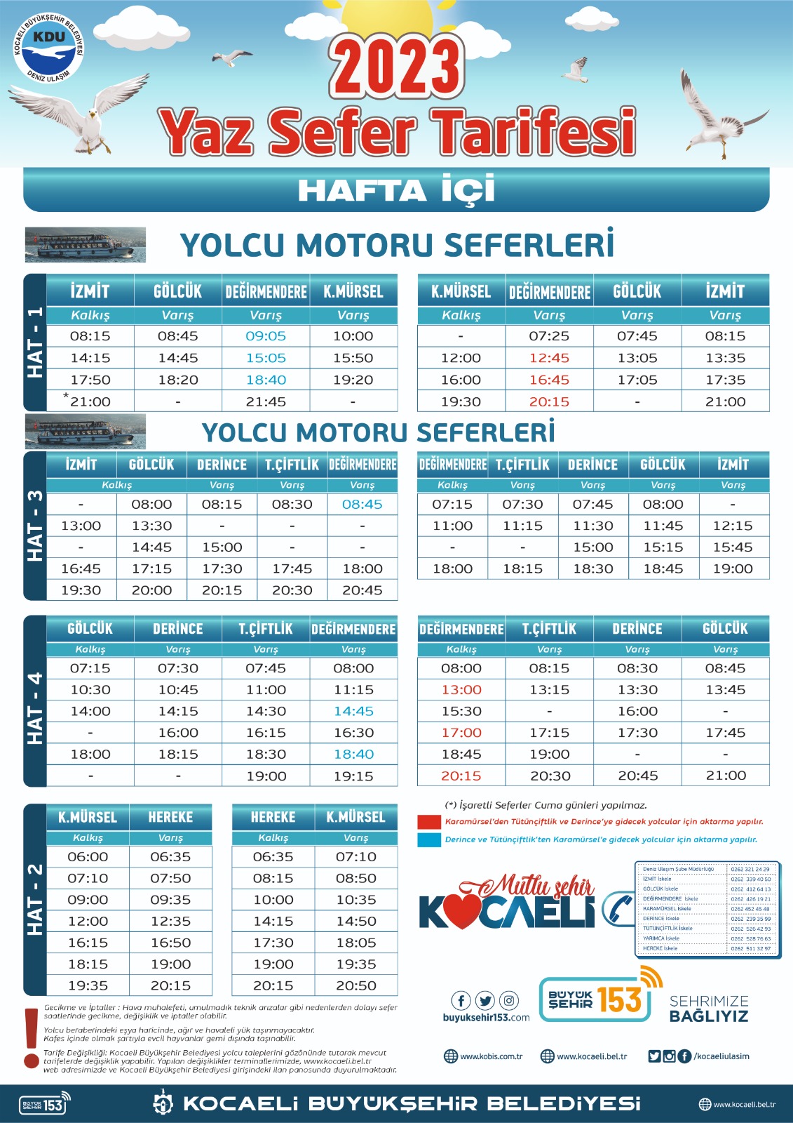 Kocaeli Büyükşehir Belediyesi Ulaşım Dairesi Başkanlığı’na bağlı Deniz Ulaşım Müdürlüğü, Yolcu vapuru seferlerinde yaz sefer uygulamasına geçiyor. Buna göre Yaz sefer uygulaması 03 Temmuz Pazartesi günü başlayacak.