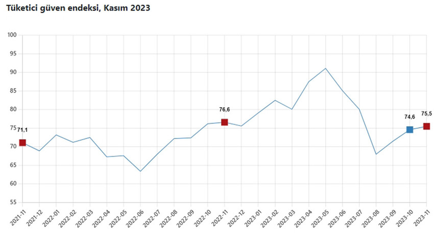 Türkiye İstatistik Kurumu ve Türkiye Cumhuriyet Merkez Bankası işbirliği ile yürütülen tüketici eğilim anketi sonuçlarından hesaplanan tüketici güven endeksi, Ekim ayında 74,6 iken Kasım ayında %1,1 oranında artarak 75,5 oldu.