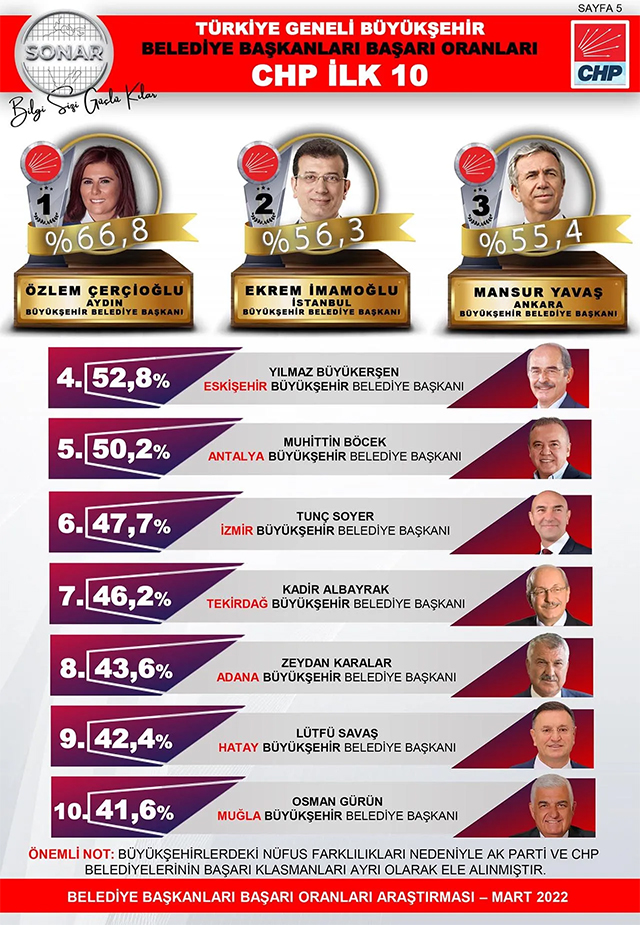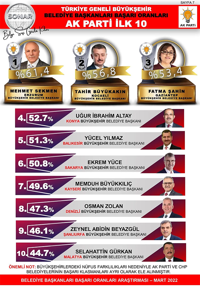 Türkiye'nin önde gelen kamuoyu araştırma firması SONAR, Türkiye genelindeki Büyükşehirler ile Ankara ve İzmir ilçe belediye başkanlarının, seçmenleri nezdindeki başarı oranlarına ilişkin anket sonuçlarını açıkladı.