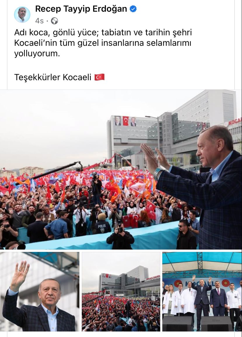 Cumhurbaşkanı Recep Tayyip Erdoğan dün Kocaeli’ye gelerek Kocaeli Şehir Hastanesi ve yanında kurumlar tarafından hayata geçirilen 2,3 milyar liralık yatırımların açılışını gerçekleştirdi. Coşkulu kalabalığa hitap eden Erdoğan gerçekleştirdiği açılış sonrası sosyal medya hesabından paylaşım yaparak Kocaeli halkına teşekkür etti. Erdoğan yaptığı paylaşımda, “Adı koca, gönlü yüce; tabiatın ve tarihin şehri Kocaeli’nin tüm güzel insanlarına selamlarımı yolluyorum. Teşekkürler Kocaeli” ifadelerini kullandı.