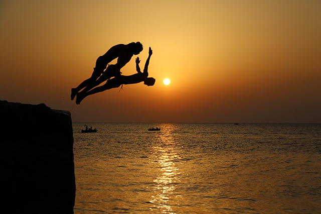 Gençlerin adrenalin dolu anları ise fotoğraf karelerine yansıdı. Günbatımında gençlerin denize atlayışı kartpostallık görüntüler oluşturdu.
