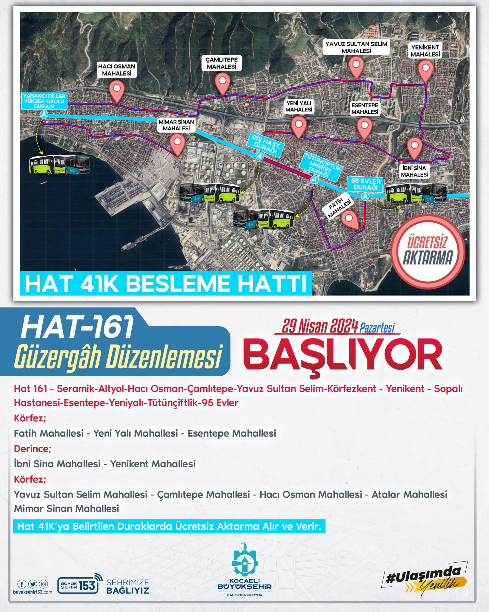 Körfez’den Kartepe’ye 4 ilçe arasında kesintisiz ulaşımı sağlayan Hat 41K’nın hizmete alınmasının ardından hat 41K ile entegre çalışacak ve ücretsiz aktarma yapılabilecek olan yeni besleme hatı seferlerine başlıyor. Hat 161, 29 Nisan itibarı ile hizmete alınıyor