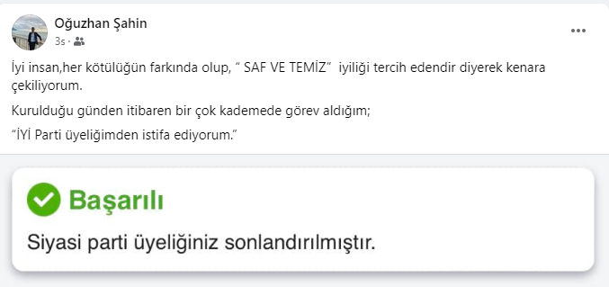 “İYİ Parti üyeliğimden istifa ediyorum.”