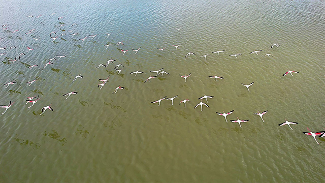 Kocaeli Körfezi'nin daimi misafirleri Flamingolar, göç mevsimi ile birlikte yeniden gelmeye başladı. Flamingoların görsel şöleni dron ile görüntülendi.