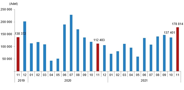Türkiye genelinde konut satışları Kasım ayında bir önceki yılın aynı ayına göre %59,0 artarak 178 bin 814 oldu. Konut satışlarında İstanbul 31 bin 706 konut satışı ve %17,7 ile en yüksek paya sahip oldu. Satış sayılarına göre İstanbul'u 17 bin 117 konut satışı ve %9,6 pay ile Ankara, 11 bin 116 konut satışı ve %6,2 pay ile İzmir izledi. Konut satış sayısının en az olduğu iller sırasıyla 36 konut ile Hakkari, 65 konut ile Ardahan ve 98 konut ile Bayburt oldu.