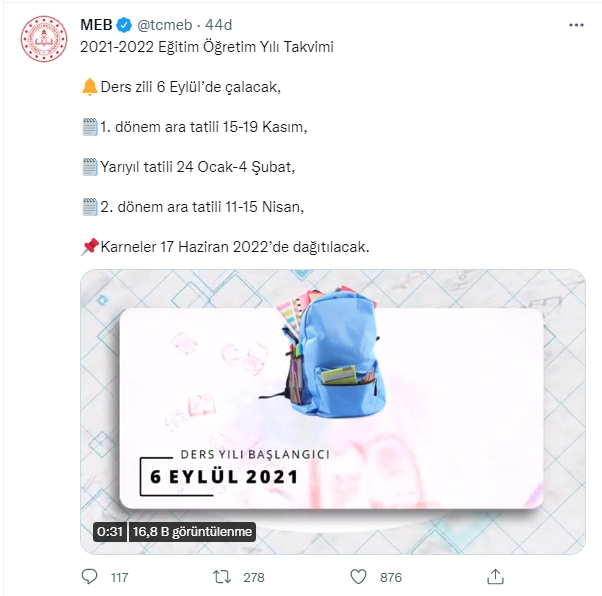 Milli Eğitim Bakanlığı (MEB), sosyal medya hesabından yaptığı paylaşımda 2021-2022 Eğitim Öğretim Yılı takvimini açıkladı.