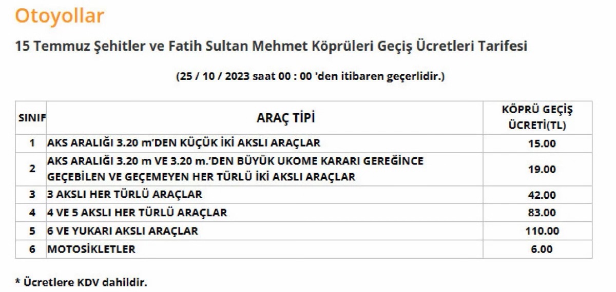 Karayolları Genel Müdürlüğü, otoyol ve köprü geçiş ücretlerinin yeniden düzenlendiğini açıkladı. Buna göre, yeni tarife 25 Ekim 2023 Çarşamba günü saat 00.00’dan itibaren geçerli olacak.