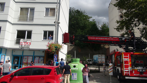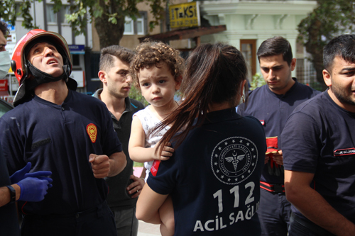 Vatandaşlar pencerenin altına çarşaf gerip, yün çuvalı koyarken, 2 yaşındaki bebek itfaiye merdiveni ile indirildi.