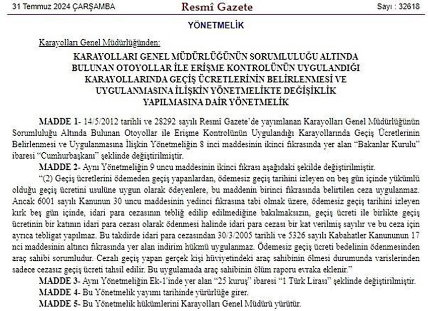 Karayolları Genel Genel Müdürlüğü'nün otoyollarda ücretini ödemeden geçiş yapanlara yönelik işlemlere ilişkin yönetmelik değişikliği Resmi Gazete'de yayımlanarak yürürlüğe girdi.