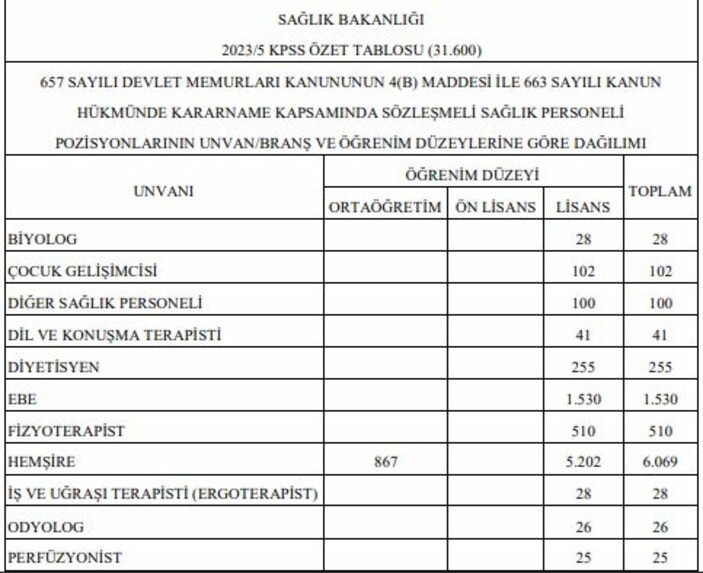 Resmi Gazete’de yayınlanan ilana göre, Sağlık Bakanlığı taşra teşkilatı hizmet birimlerinde istihdam edilmek üzere 31 bin 600 sözleşmeli sağlık personeli Kamu Personeli Seçme Sınavı (KPSS) sonucuna göre ÖSYM tarafından yapılacak merkezi yerleştirme ile alınacak.