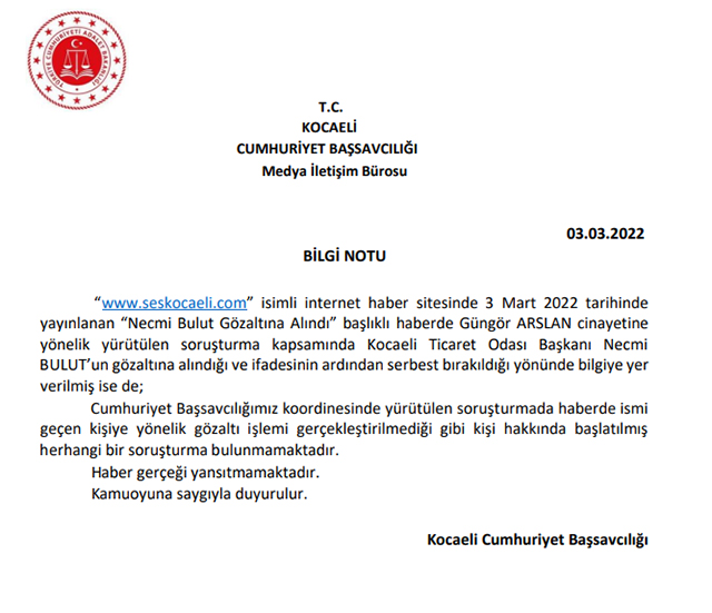 Yapılan açıklamada, “www.seskocaeli.com” isimli internet haber sitesinde 3 Mart 2022 tarihinde yayınlanan “Necmi Bulut Gözaltına Alındı” başlıklı haberde Güngör ARSLAN cinayetine yönelik yürütülen soruşturma kapsamında Kocaeli Ticaret Odası Başkanı Necmi BULUT’un gözaltına alındığı ve ifadesinin ardından serbest bırakıldığı yönünde bilgiye yer verilmiş ise de; Cumhuriyet Başsavcılığımız koordinesinde yürütülen soruşturmada haberde ismi geçen kişiye yönelik gözaltı işlemi gerçekleştirilmediği gibi kişi hakkında başlatılmış herhangi bir soruşturma bulunmamaktadır. Haber gerçeği yansıtmamaktadır” denildi.