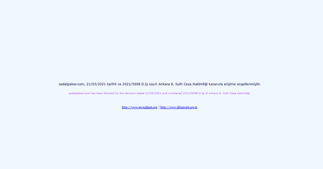 Sedat Peker'e ait olan http://sedatpeker.com adresi Ankara 8. sulh ceza hakimliğinin 21.05.2021 tarihli ve 2021/5968 değişik iş sayılı kararıyla engellendi.