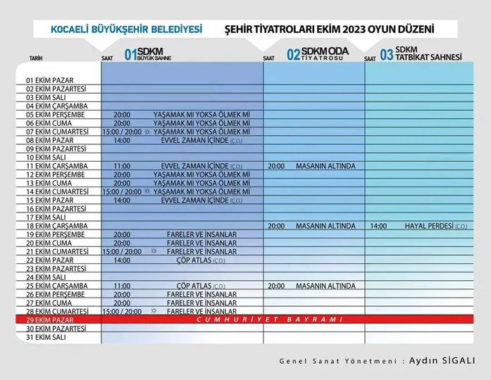 Kocaeli Şehir Tiyatroları Genel Sanat Yönetmeni Aydın Sigalı, “Sezonumuz başlıyor” diyerek müjdeyi verip ekim ayında sahnelenecek oyunları paylaştı.