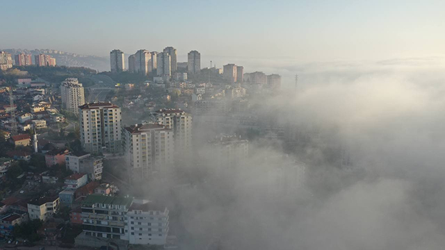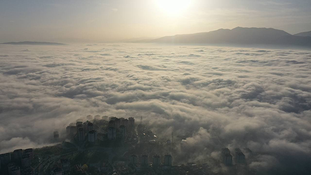 Kocaeli'de yaklaşık 1 hafta etkisini gösteren sis, sabah ve akşam saatlerinde de devam etti. Gökyüzünü kaplayan bulutların oluşturduğu eşsiz manzara da görenleri kendine hayran bıraktı. Sis bulutları zirvelerde görsel şölen sunarken, bulutların adeta dans eden görüntüsü ise havadan drone ile görüntülendi.