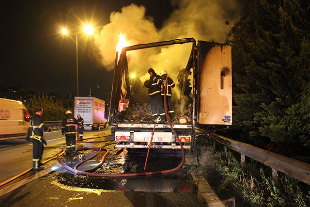 TEM Otoyolu Kocaeli geçişinde kargo şirketine ait bir tırın dorse kısmı alev alev yandı. Yangın itfaiye ekiplerince söndürülürken, dorse kısmı ve içerisindeki kargolar yanarak kullanılamaz hale geldi.
