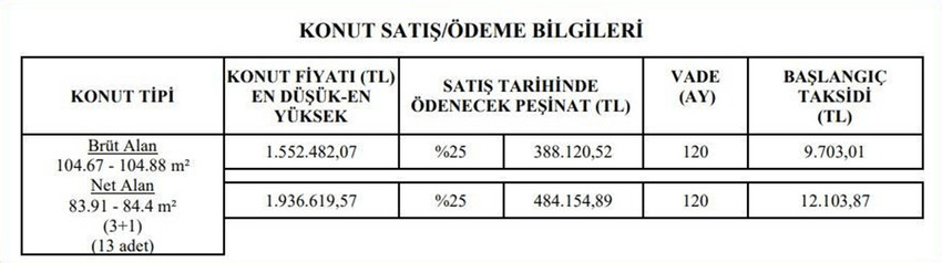 Konutları satın almayı düşünen vatandaşlardan TOKİ, peşinat olarak yüzde 25'lik bir ödeme yapmalarını talep ediyor. Bu ödemenin ardından kalan yüzde 75'lik bölüm ise 120 ay vadeli bir ödeme planıyla geri ödeniyor. Söz konusu evlerin taksit ödemelerinin ise aylık 9.703 TL'den başladığı belirtiliyor.
