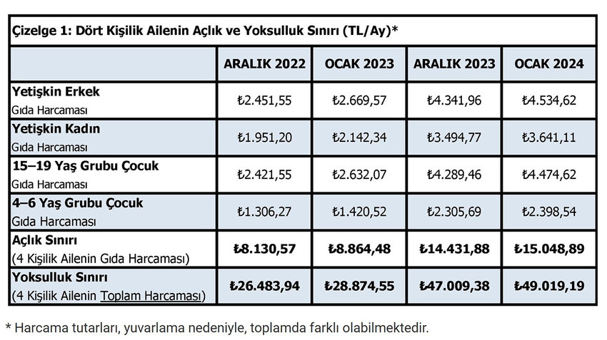 Gıda harcaması ile giyim, konut (kira, elektrik, su, yakıt), ulaşım, eğitim, sağlık ve benzeri ihtiyaçlar için yapılması zorunlu diğer aylık harcamalarının toplam tutarı ise (yoksulluk sınırı) 49 bin 19 TL’ye yükseldi.