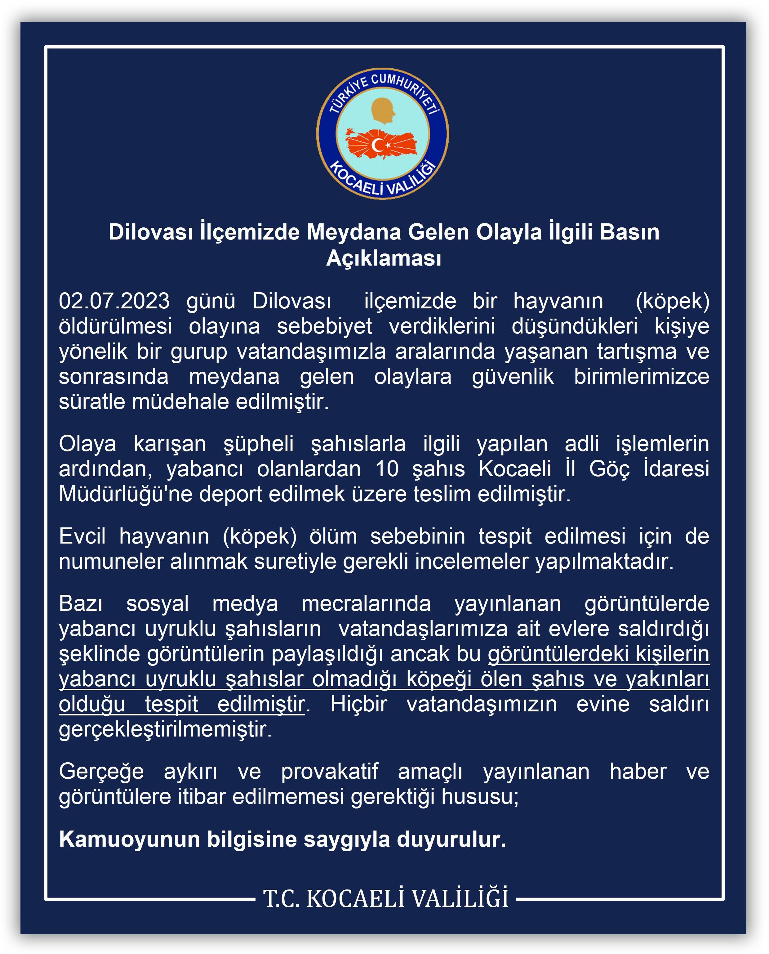 "Bazı sosyal medya mecralarında yayınlanan görüntülerde yabancı uyruklu şahısların vatandaşlarımıza ait evlere saldırdığı şeklinde görüntülerin paylaşıldığı ancak bu görüntülerdeki kişilerin yabancı uyruklu şahıslar olmadığı, köpeği ölen şahıs ve yakınları olduğu tespit edilmiştir. Hiçbir vatandaşımızın evine saldırı gerçekleştirilmemiştir. Gerçeğe aykırı ve provokatif amaçlı yayınlanan haber ve görüntülere itibar edilmemesi gerektiği hususu kamuoyunun bilgisine saygıyla duyurulur."