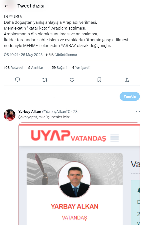 “Daha doğuştan yanlış anlayışla Arap adı verilmesi, Memleketin "katar katar" Araplara satılması, Araplaşmanın din olarak sunulması ve anlaşılması, İktidar tarafından sahte işlem ve evraklarla rütbemin gasp edilmesi nedeniyle MEHMET olan adım YARBAY olarak değişmiştir.”