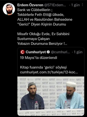 Daha 5 gün önce bu ülkenin aydını Türkan Saylan için ‘ölüm yıl dönümü sebebi ile bir bacağımızı kaldırıp 3 tur dönüp ruhuna yolladık’, kız ve erkek öğrencileri ayrı sıralarda oturtmaya çalışan bir okul müdürünün şikayet üzerine görevden alınmasına ‘Azgın azınlık zafer kutluyor’, Vali Kübra Güran Yiğitbaşı için ‘Erkeklerle tokalaşan bir kadın valinin ben neyini tebrik edeyim” yorumlarını yapan, tek tek festivallerin iptal edilmesi için çalıştıklarını açıklayan, insanlığa karşı içindeki kin ve nefretin tedavi edilmesi gereken bu kişi akli dengesi yerinde mi diye bakılması gerekirken, kalkıp söz sahibi yapılıyor, söyleşilerde ağırlanıyor.